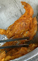 • จากนั้นก็ตั้งกะทะให้ร้อน ใส่น้ำมันลงไป พอน้ำมันเดือด ก็นำโครงไก่ชุปแป้งทอด พอโครงไก่เหลือง กรอบแล้ว ก็เป็นอันใช้ได้